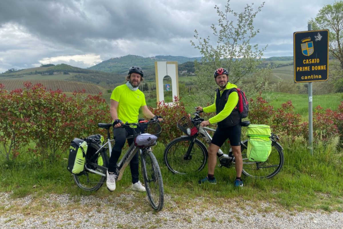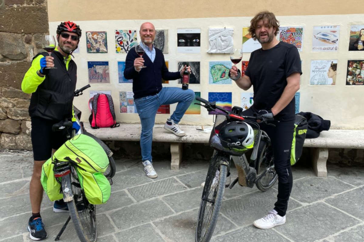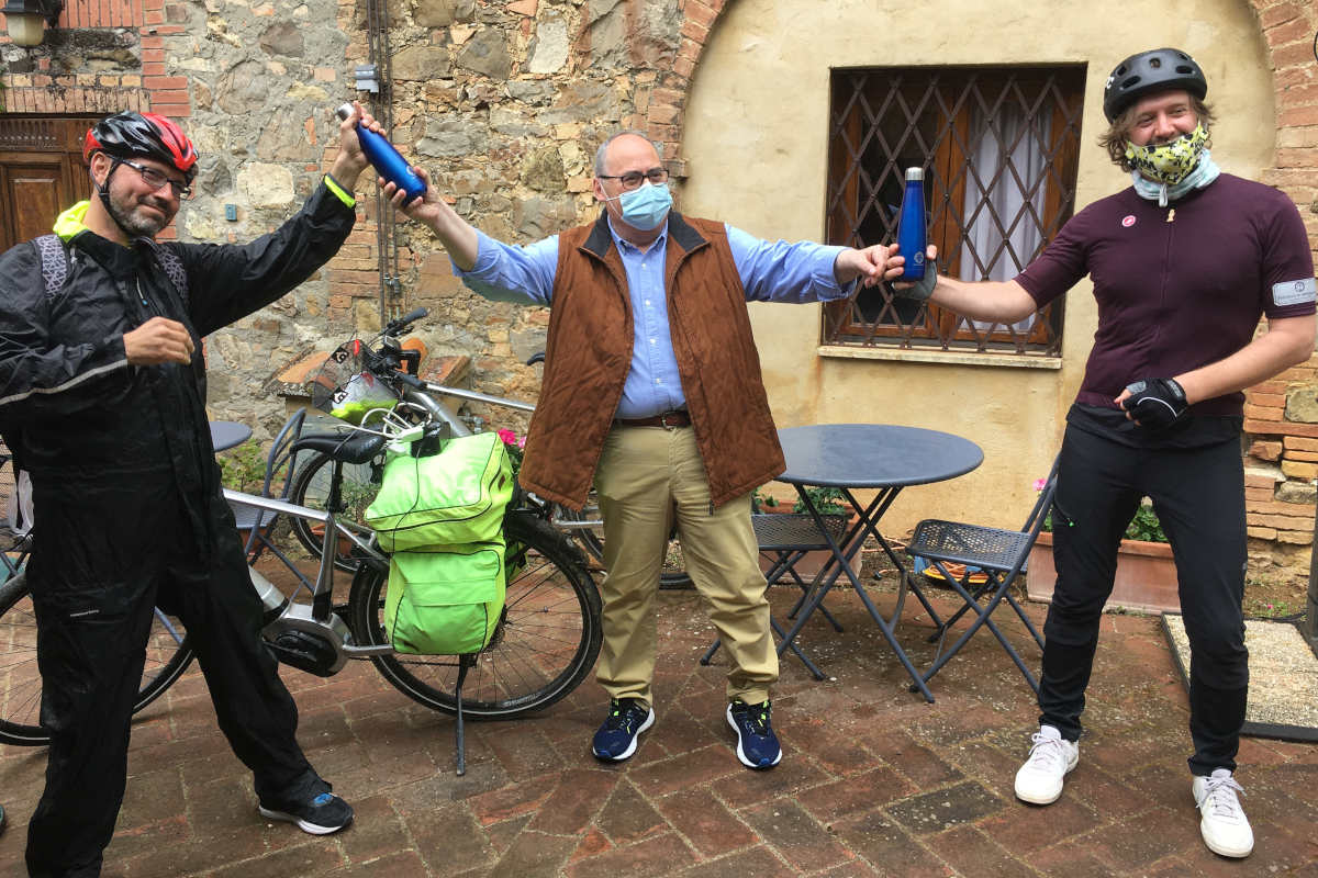 Lo sforzo viene però ripagato dall’accoglienza dello stato maggiore del Consorzio di Tutela del Brunello di Montalcino, presente in piazza per un brindisi con la già grande annata 2016 all’impresa di Bike&Wine Press. Inoltre, il vicepresidente del Consorzio Riccardo Talenti e il direttore Michele Fontana ci hanno regalato col sorriso le magliette ufficiali del prossimo Giro d’Italia, che farà tappa proprio nella città del Brunello.