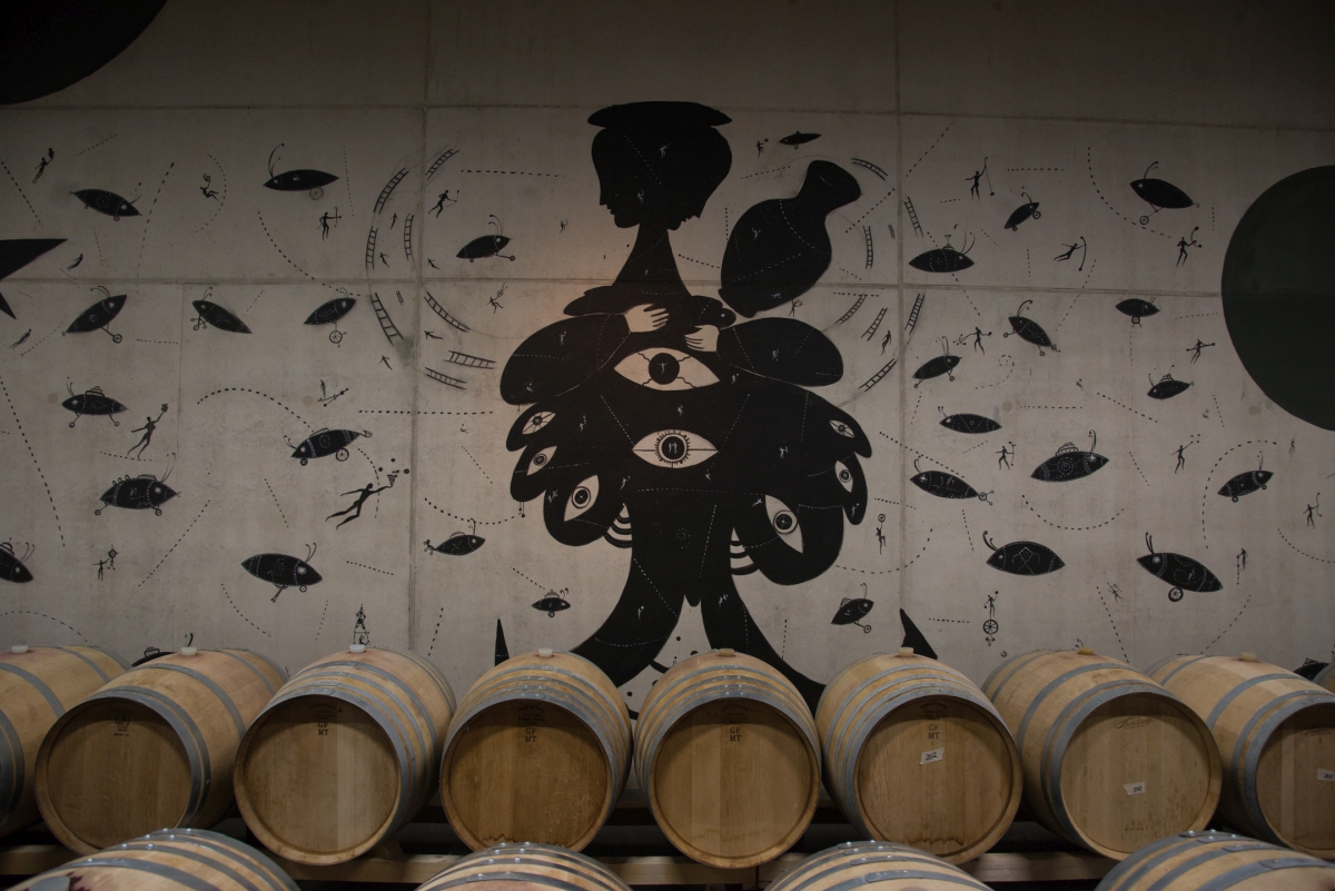 I fratelli Flavio e Luca Nuti sono i proprietari di questa cantina, la cui fama è legata ai vini dai vitigni internazionali che, si sa, in Costa Toscana hanno trovato un perfetto habitat e in particolare nella provincia di Pisa offrono eccellenti risultati (basti pensare ai traguardi raggiunti con il Cabernet Franc dai produttori locali). Ma non c’è solo il Cabernet Franc o l’Igt Toscana La Regola: tra i vini prodotti in azienda, ci è piaciuta moltissimo l’Eccezione, nome appropriato perché si tratta di un metodo classico che nasce per sfidare il tempo. In cantina opera l’enologo di casa, Edoardo Crecchi, con la consulenza di quello esterno che è Luca Rettondini. Ma il primo nome che viene citato da Flavio Nuti, durante la mia visita, è quello di un artista. Si chiama Stefano Tonelli e le sue opere sono disseminate ovunque: in cantina, tra i vigneti e in barricaia dove ha realizzato una sorta di danza cosmica tra figure danzanti, piccoli esseri laboriosi e monadi a forma di pesci. “La gente visita questa cantina che perché ha una struttura intrinseca fatta di elementi d’arte. Si parla di vino attraverso l’arte contemporanea e attraverso la storia del luogo, che è una storia antica, risalente al popolo degli etruschi e alla loro cultura enoica”, ci racconta Nuti. “Noi offriamo un percorso di visita attraverso questi elementi, ricordando l’antichità e l’umanità che caratterizza questo luogo”. E La Regola è anche un precursore dello sviluppo vitivinicolo della valle del fiume Cecina perché nasce nel 1990, ben 15 anni prima dell’arrivo dei Lunelli che oggi sono presenti con Casale Podernovo a Terricciola. “Siamo gli ‘storici’ di un territorio che ha attratto grandi nomi e sta crescendo molto in termini di accoglienza e strutture ricettive, in un paese che conta 1.500 abitanti durante l’inverno e arriva a 10mila d’estate”, rimarca Nuti.