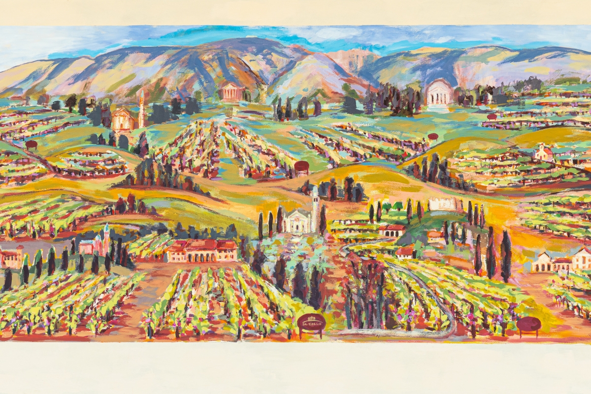 Il dipinto dell’artista Giusy Vinante che raffigura la cantina e i colli di Asolo